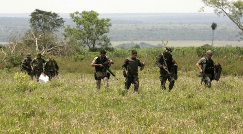 Soldiers patrol the location near a military outpost in Tacuati, some 360 km (224 miles) north of Asuncion, January 12, 2009. A security operation was mounted in the area of Tacuati after a military outpost was robbed of its weapons and set on fire on December 31, 2008 by a peasant group called «Army of the Paraguayan People», the army spokesperson said. REUTERS/Jorge Adorno (PARAGUAY)