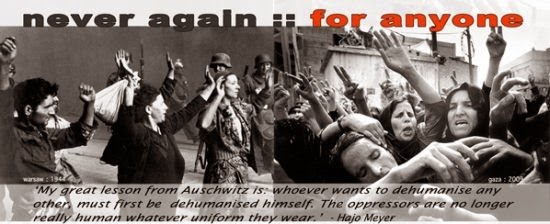 Además, estamos indignados y repugnados por el abuso que Elie Wiesel ha hecho de nuestra historia en estas páginas para justificar lo injustificable: el brutal esfuerzo de Israel para destruir Gaza y el asesinato de más de 2000 palestinos, incluyendo muchos cientos de niños. Nada puede justificar el bombardeo de refugios de la ONU, hogares, hospitales y universidades. Nada puede justificar que se deje a un pueblo sin electricidad ni agua.