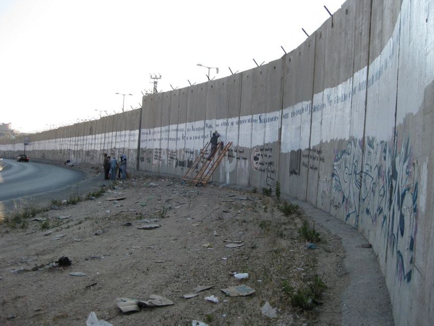 Pintando graffitis en el muro que rodea a Jerusalén.