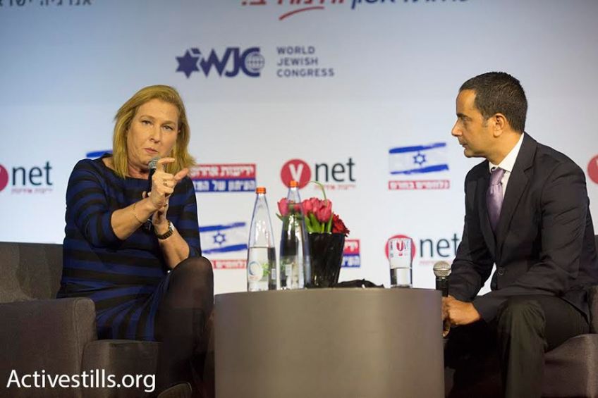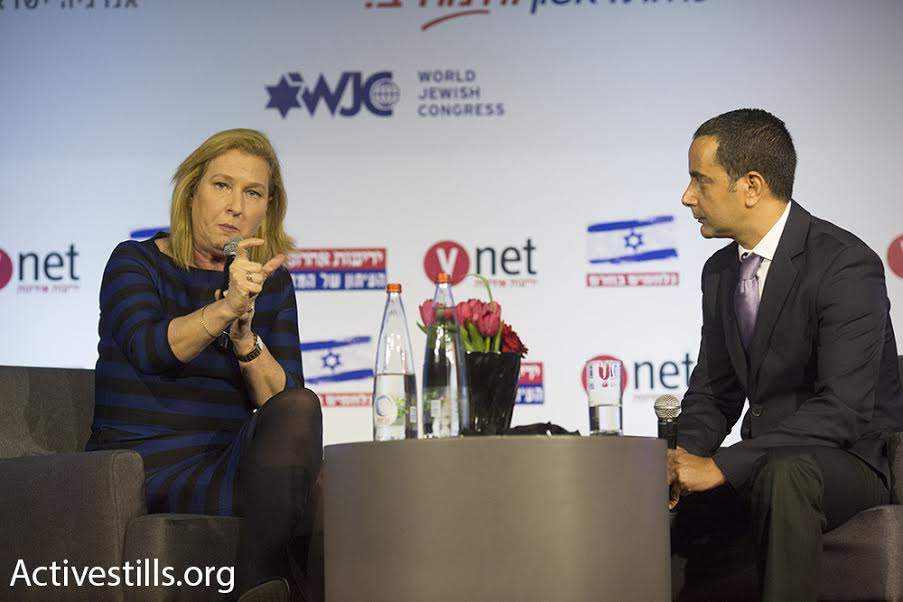 La legisladora del partido Unión Sionista Tzipi Livni es entrevistada durante la conferencia Stop BDS (Oren Ziv/Activestills.org)