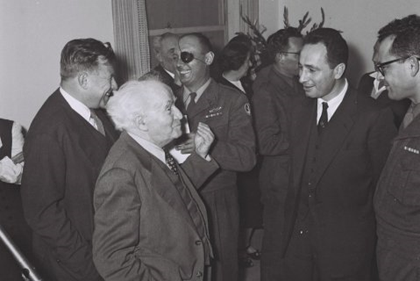 El primer ministro David Ben Gurion con su principal ayudante, Shimon Peres. Al fondo el ministro de Defensa Moshe Dayan y el ayudante de Ben Gurion Teddy Kollek