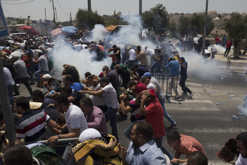 Represión con gas lacrimógeno a quienes rezaban en la calle el 21 de julio en el barrio Ras al-Amud.
