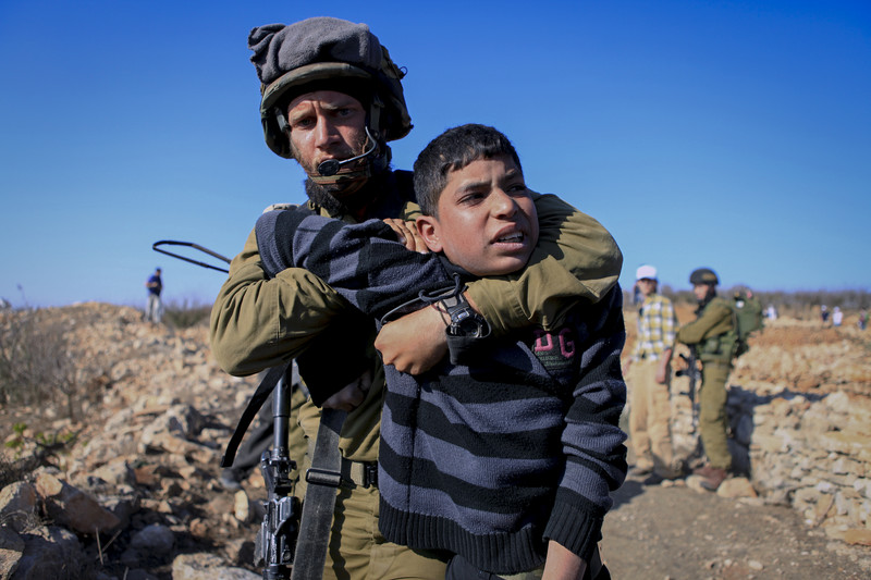 An Israeli soldier arrests a Palestinian child during a protest against the Israeli occupation and settlements in the West Bank village of Beit Ummar, November 20, 2012.</p>
