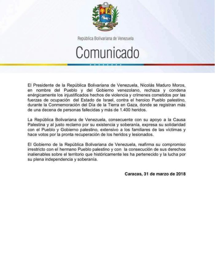 Publicado el 03/04/2018 en 700 × 895 en Tres países condenan la masacre israelí de palestinos del Día de la Tierra: Cuba, Venezuela y Bolivia