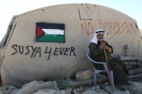 Palestinian schoolgirls wait for buses in the shadow of the Israeli wall, inside the Shua’fat refugee camp near Jerusalem. Photograph Jim Hollande