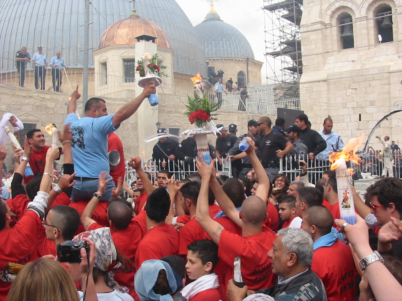 Cristianos rigurosamente vigilados durante la celebración del Fuego Santo (Sábado de Pascua) en la azotea de la Iglesia del Santo Sepulcro, en Jeruslalén, abril de 2011 (Foto: María Landi).