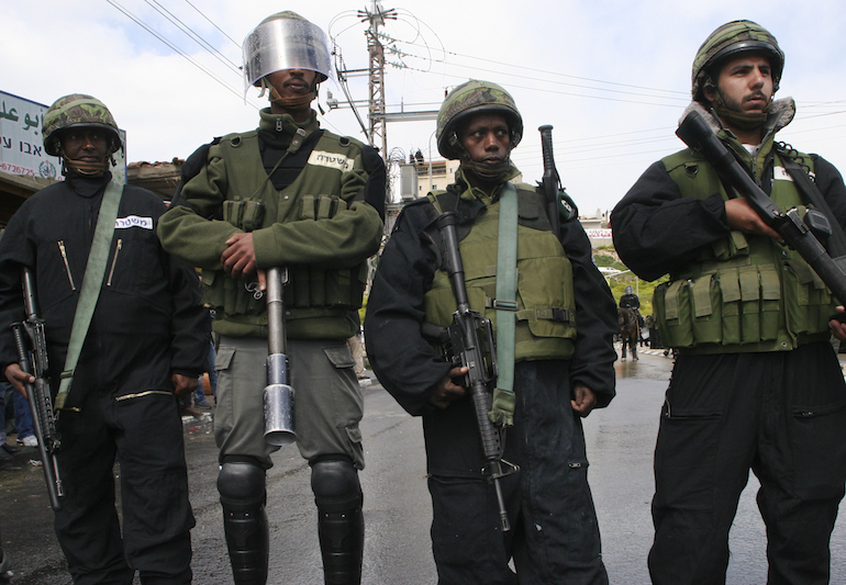 Soldados etíopes-israelíes en la ciudad palestina Umm al-Fahm, en el norte de Israel. (Mati Milstein)