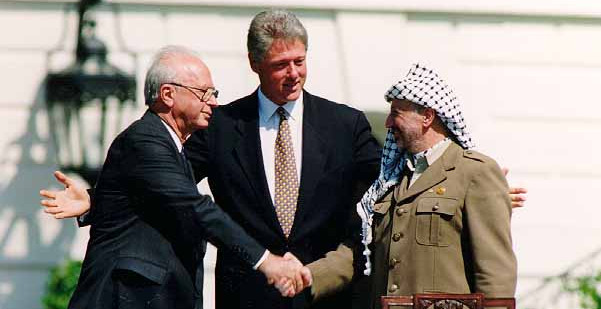 El Primer Ministro israelí Isaac Rabin, y el Presidente de la OLP Yaser Arafat, se dan la mano en la Casa Blanca, en presencia del Presidente de Estados Unidos Bill Clinton, tras la firma de los Acuerdos de Oslo, el 13/9/1993. (Foto: Vince Musi/The White House).