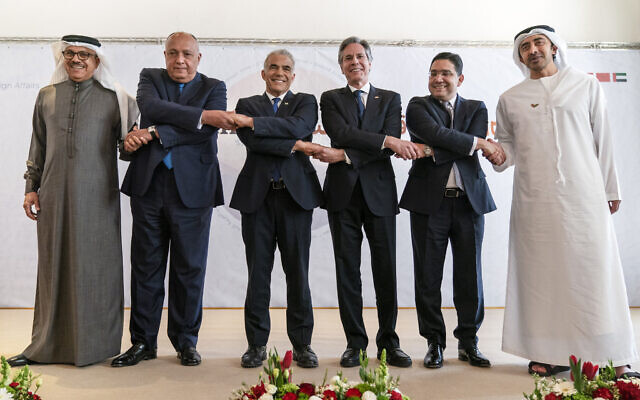 After meeting for the Negev Summit, Bahrain’s Foreign Minister Abdullatif bin Rashid al-Zayani, left, Egypt’s Foreign Minister Sameh Shoukry, Israel’s Foreign Minister Yair Lapid, U.S. Secretary of State Antony Blinken, Morocco’s Foreign Minister Nasser Bourita, and United Arab Emirates’ Foreign Minister Sheikh Abdullah bin Zayed Al Nahyan, pose for a photograph Monday, March 28, 2022, in Sde Boker, Israel. (AP Photo/Jacquelyn Martin, Pool)