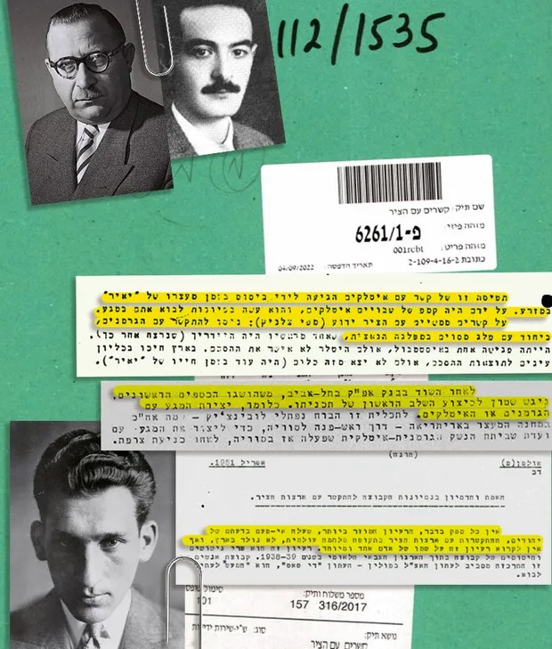 Arriba, de izquierda a derecha: Natan Yellin-Mor, Naftali Lubenchik. Abajo: Avraham «Yair» Stern, líder del Lehi, y los expedientes recientemente desclasificados. Créditos: Archivos del Estado, Izkor online, David Eldan / Biblioteca Nacional. Edición fotográfica: Masha Zur Gluzman