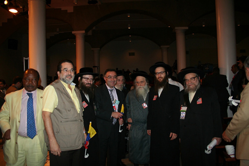 Rabino Yisroel Dovid Weiss, Rabino Moshe Dov Beck (sobrevivente do holocausto) Rabino Dovid Feldman e Rabino Mordechai Weberman Weiss compartilham com funcionários venezuelanos no evento com o Presidente Chávez em Cooper Union, Nova Iorque, 2006. Crédito: Neturei Karta
